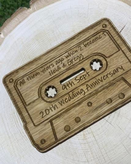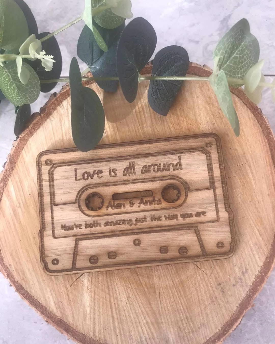These personalised cassette tapes are the exact size as a cassette tape. They make a beautiful memory gift. Add names, song title and the special occasion.